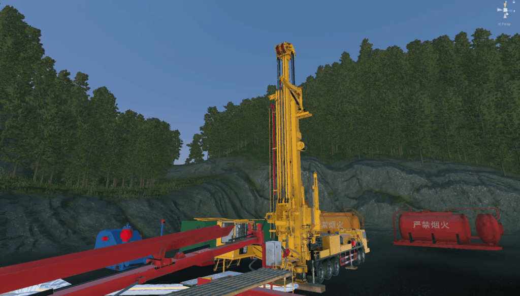 软件系统核心基于DataMesh FactVerse数字孪生平台,融合动力学仿真技术,实现对深井钻机工作过程的精准模拟。不仅还原真实设备操作机构,更通过机理模型实时计算钻机在各类工况下的响应,包括发动机启停、液压系统动作、钻桅倾角变化、钻进工艺等,让学员在虚拟环境中获得近乎真实的操作反馈。