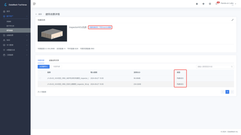 打开并登录DataMesh FactVerse平台,在左侧菜单栏中选择“数字资产-资源库”,点击新增图标,新建资源文件夹。点击“上传”,将使用插件转换服务后生成的zip文件上传至资源库。