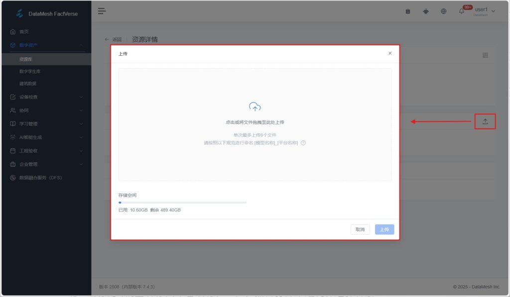 上传资源:在资源库页面,您可以点击【上传】按钮
