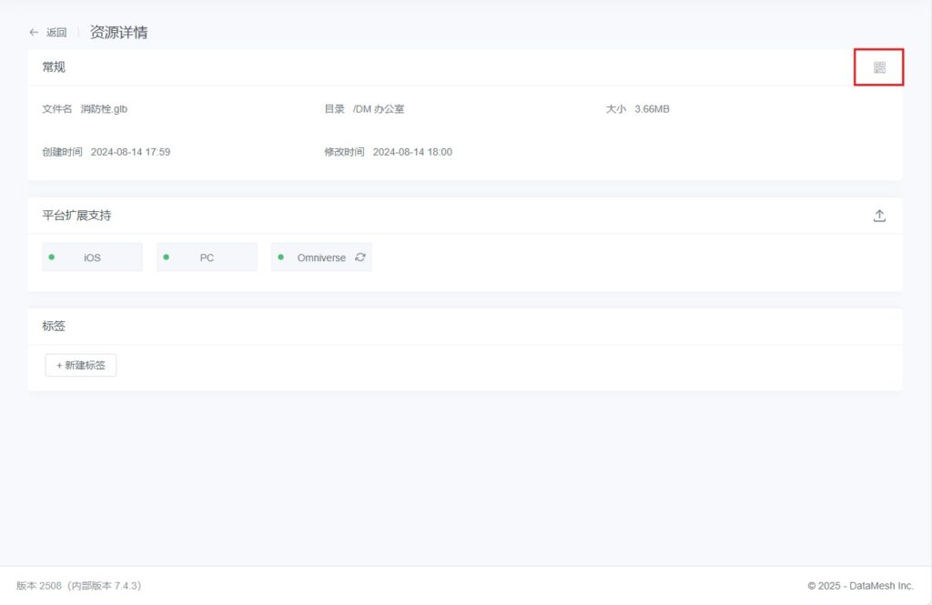 ,即可打开该资源的详情页面。资源详情页展示了该资源的基础信息、标签分类以及扩展支持信息(模型类资源)等。不同类型资源显示的内容略有差异。