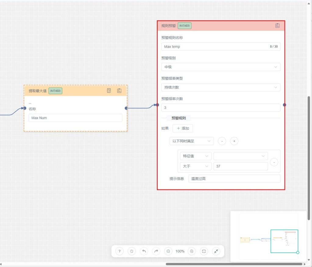 - 拖动【预警规则】节点至画布,并连接上游节点。