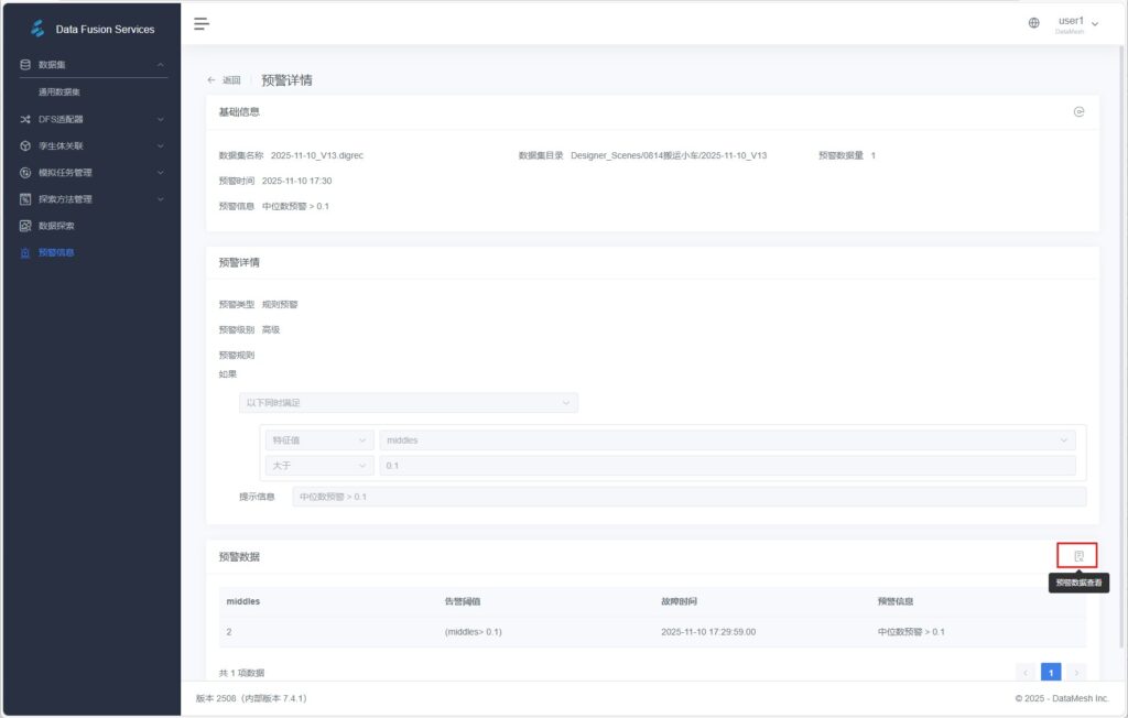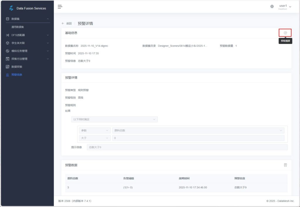 对于已触发的预警,您可以在系统中查看详细预警信息,并支持关联回溯至探索流程以理解其产生原因。