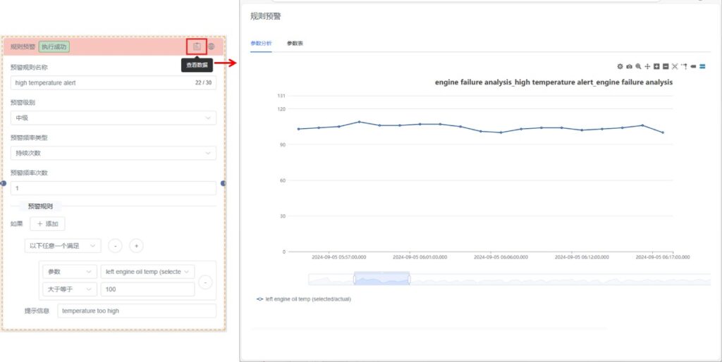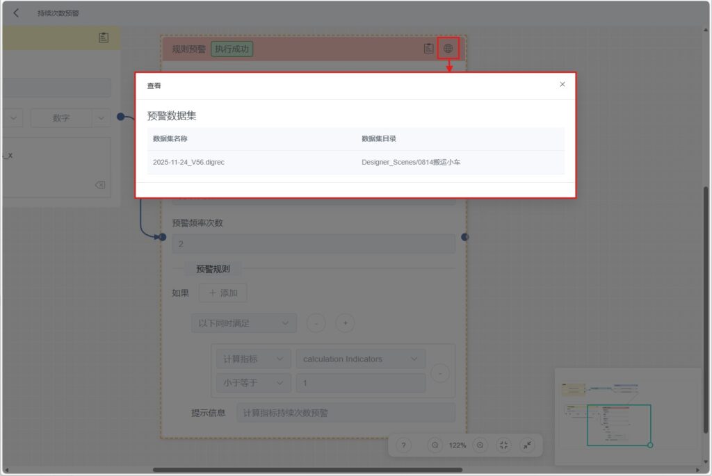 c) 在画布中,找到触发该预警的规则预警节点,点击右上角【查看数据】图标
