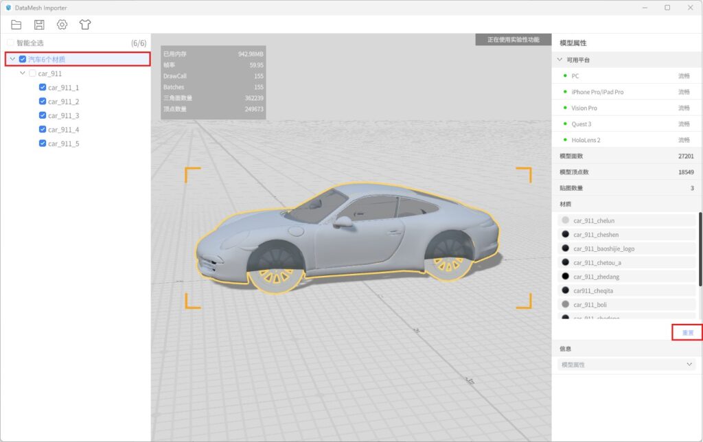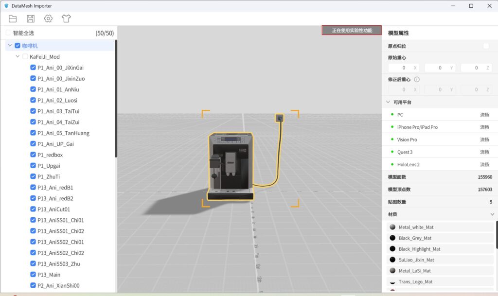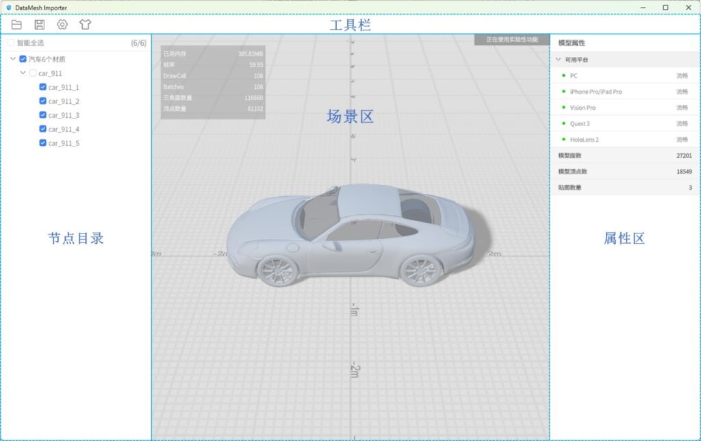 DataMesh Importer 是一个轻量且高效的 3D 模型查看工具,它支持导入多种格式的 3D 模型资源,包括 FBX、GLTF、OBJ、PLY、3MF 和 STL 格式。使用 DataMesh Importer,您可以直观地了解导入模型的结构和基本属性,快速预览模型在不同设备上的运行效果,并对模型的材质属性进行调整和编辑,以优化模型的呈现效果。