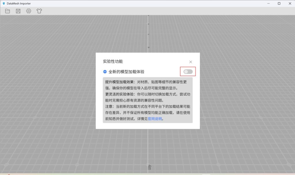 | DataMesh Importer | 需用户手动开启 | 开启路径:设置 > 实验性功能 > 全新的模型加载体验 |