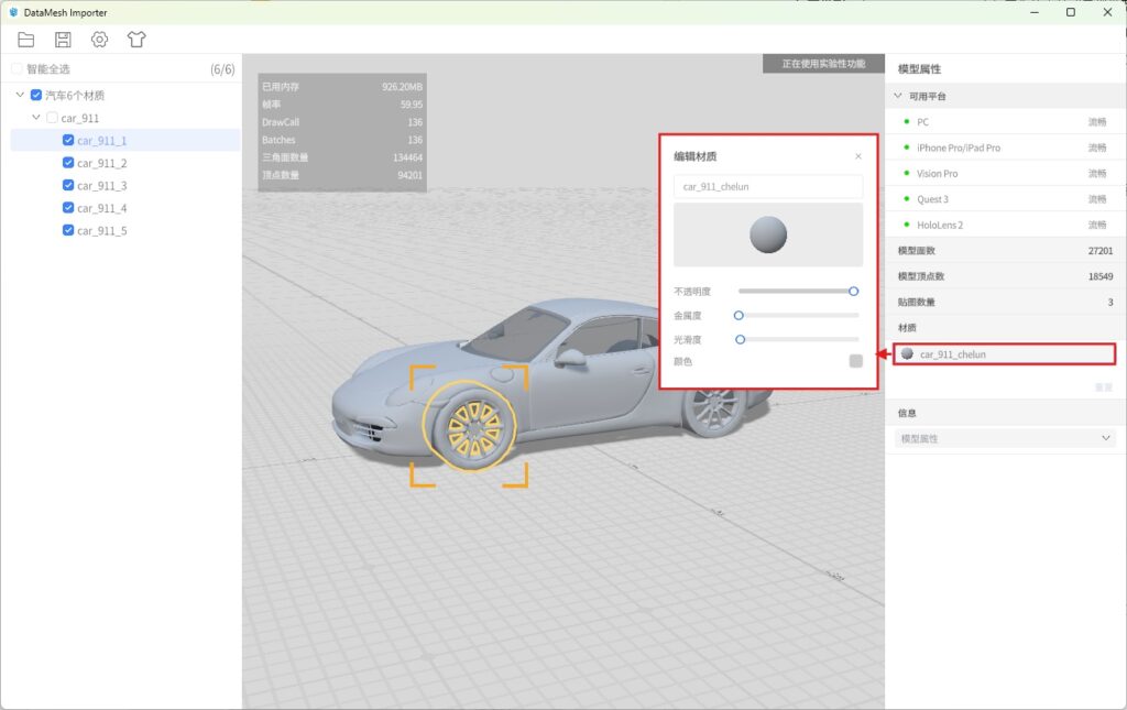 模型属性区展示当前模型在各平台上的运行流畅度及其基本属性信息。同时,属性区提供了材质编辑功能,允许用户对模型的材质进行调整和修改。自定义调整材质的颜色和透明度等属性,以实现所需的视觉效果。