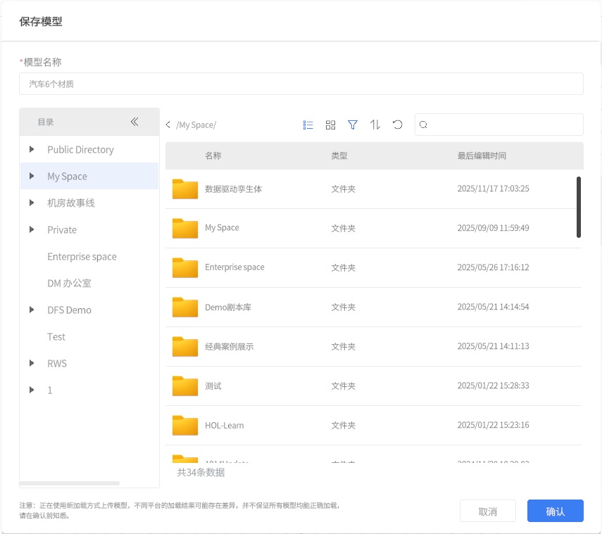 注意:应避免和云端相同文件格式的模型文件重名,建议在另存模型时选择一个与现有文件不同的文件名或在同一路径下选择一个不同的文件夹。