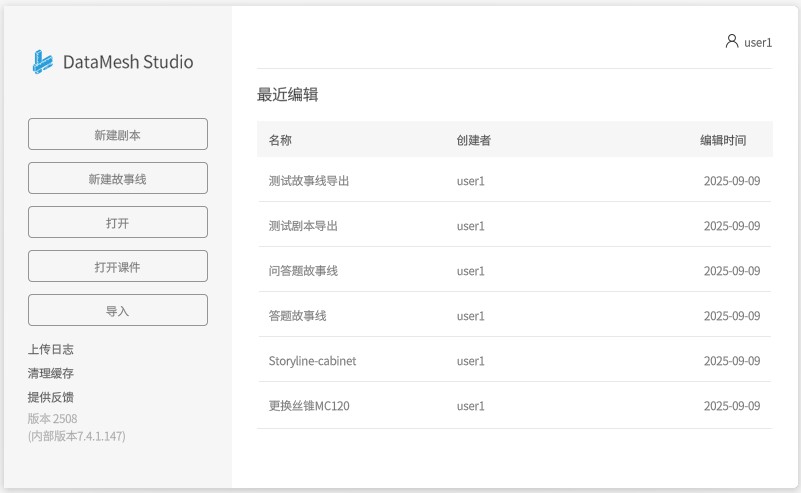 登录成功后,用户将进入主页。“主页”是编辑界面的入口页面。通过“主页”视图,您可以快速访问最近打开的剧本文件、以及创建新剧本、打开云端剧本、导入本地剧本、清理缓存、上传日志等操作。