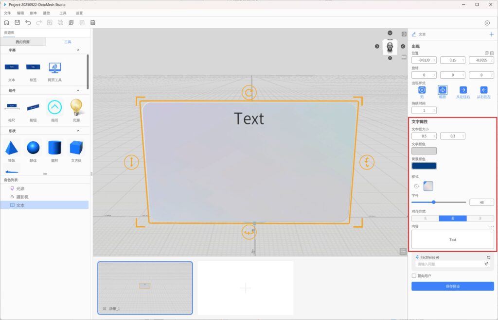 您可以通过放置模式在场景中添加文本工具。支持位置、旋转、大小等属性的调整。