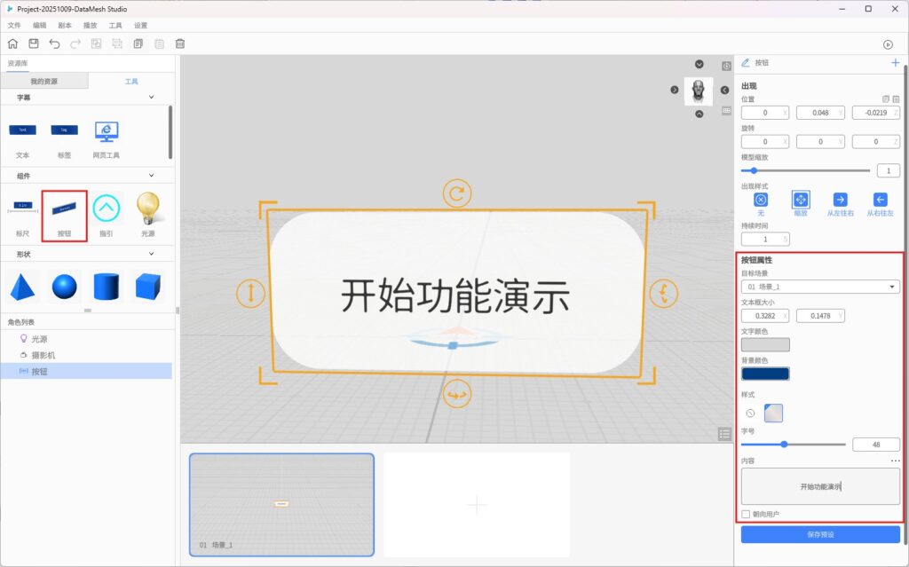 在 DataMesh Studio 中,角色是指用于构建 3D 内容的资源,包括 3D 模型、附件资源、内置工具模型、扩展小工具、光源、摄影机等。用户可以将这些角色组合在一起,创建出逼真的 3D 场景,用于展示、培训、演示等应用场景。