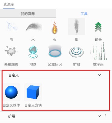 DataMesh Studio 在资源库的工具窗格中内置了各种工具模型,例如字幕、组件、形状、标识、手、IoT 等,这些模型可以为用户在剧本制作中提供辅助作用。这些工具模型的添加方式与添加普通模型一样,可以通过放置模式添加到场景中。