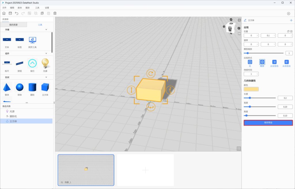 上传完成后,您可以在 DataMesh Studio 的资源库的我的资源中,通过简单的拖放操作添加到场景中,并且可以根据具体需要移动、旋转、缩放模型,以及设置模型属性、添加动作等操作。