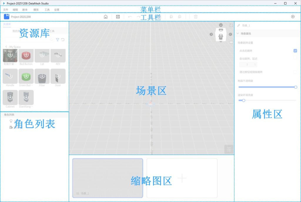 缩略图区位于场景区下方,包含了剧本中所有场景的缩略图。类似于 PPT 中的幻灯片列表,缩略图区用于展示每个场景的缩略图,并显示场景的名称信息。