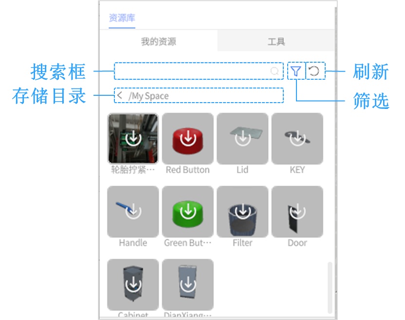 我的资源包含用户上传的各类用于构建三维场景的资源。