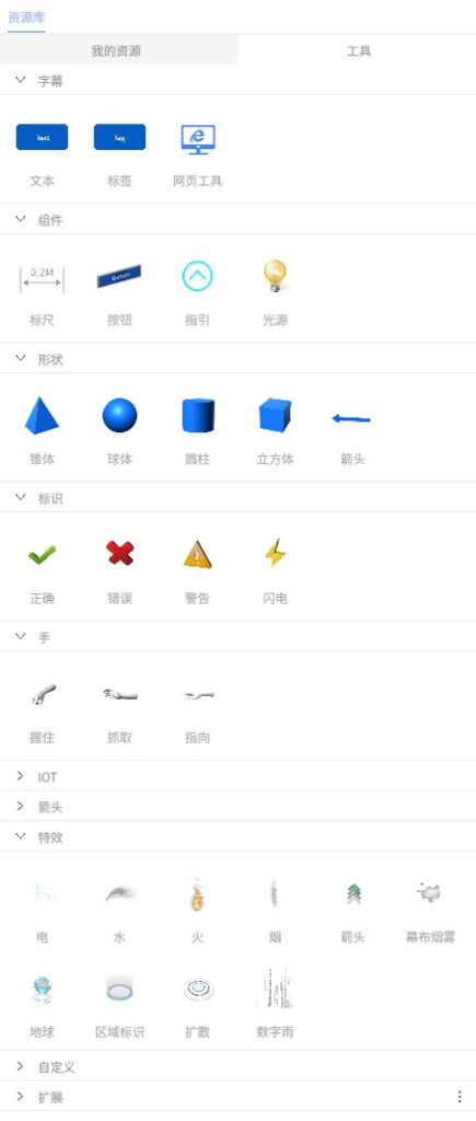 资源库窗格分为我的资源和工具两部分。