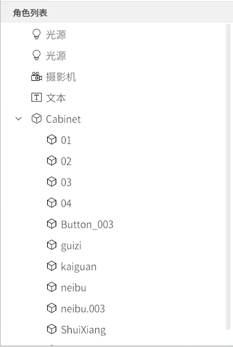 角色列表位于编辑界面的左窗格下部,其展示了当前场景内包含的全部角色。