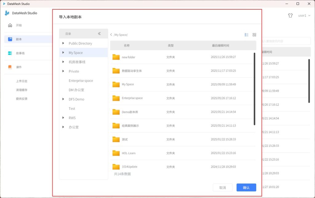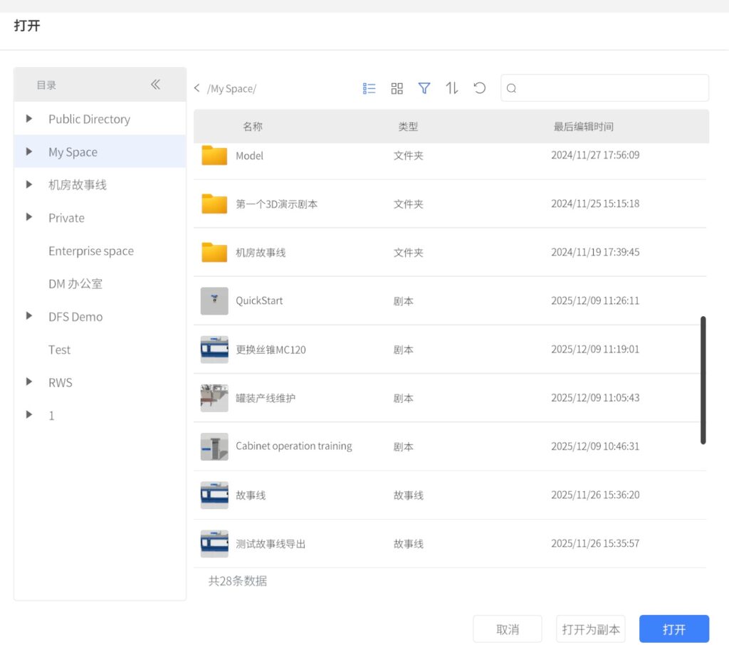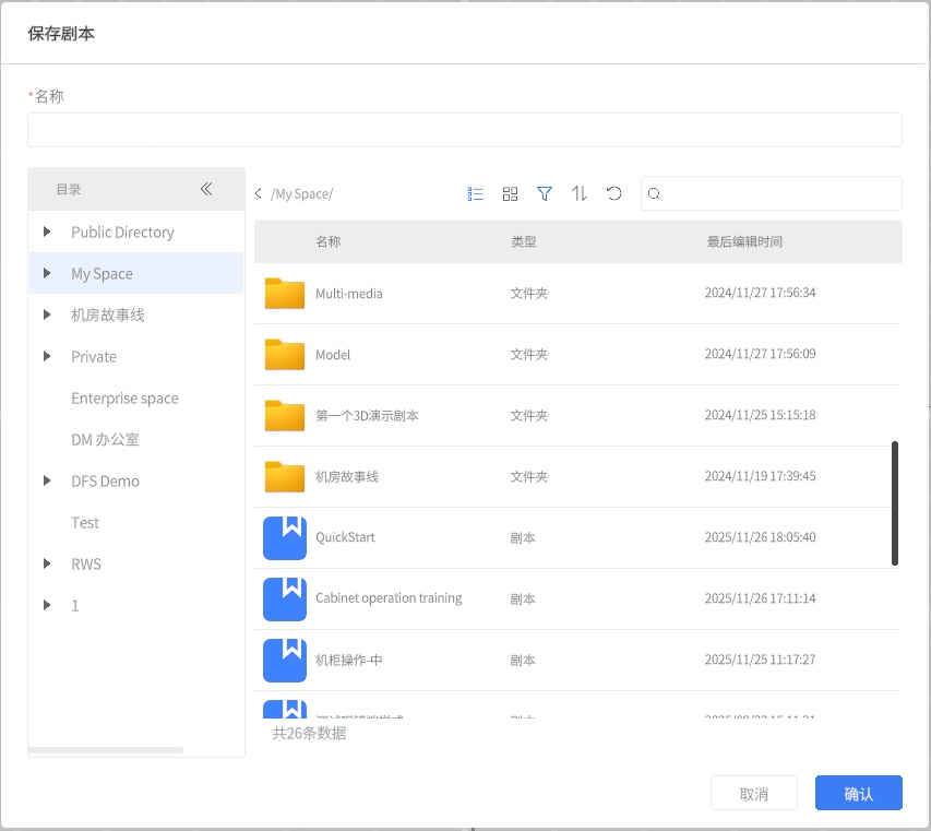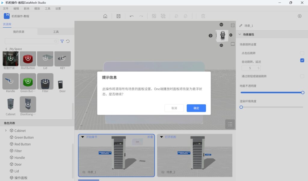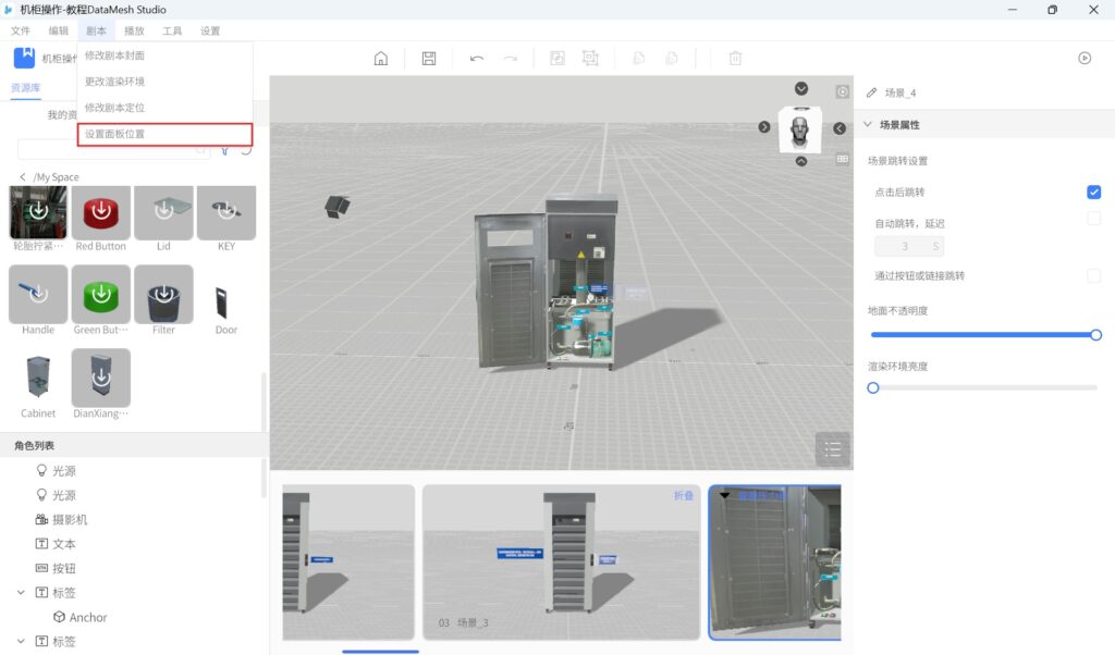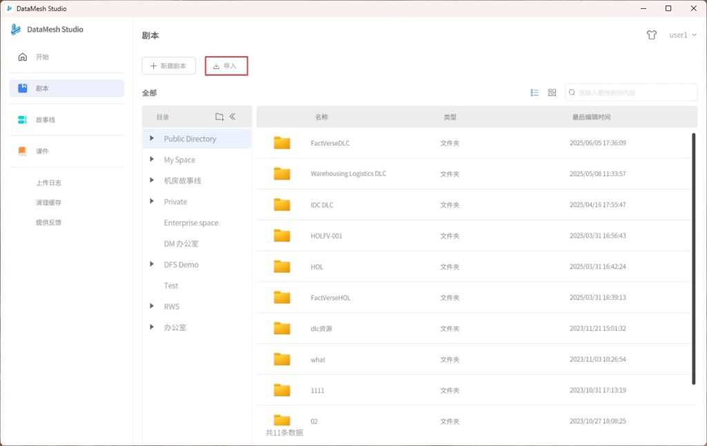 剧本是在 DataMesh Studio 中编辑完成的工程文件,类似于 PPT 演示文稿。它可以包含多个场景,每个场景可以包含多个模型、图片等附件资源,以及字幕、组件等工具资源。在剧本中可以设置场景之间的跳转关系,实现交互式场景切换。剧本的格式为 .dirpkg,可以在 DataMesh Studio 中进行新建、编辑、保存、导入和导出。剧本的管理可在 DataMesh FactVerse 平台中的数字资产模块中进行。