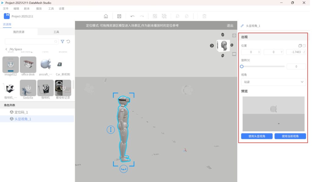 头显视角定位用于在剧本编辑过程中,模拟学员在佩戴头显设备时的初始观察位置与方向。