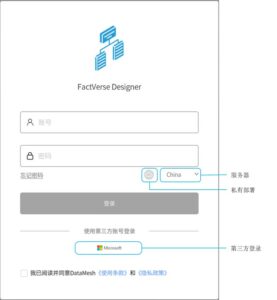 在 FactVerse Designer 登录页面中,您可以使用 FactVerse 用户账号和密码进行登录。以下是登录的步骤: